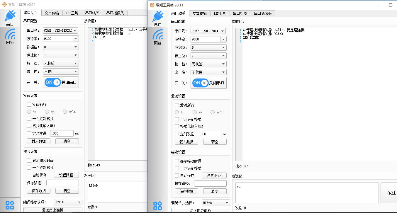 接下来打开两个 零知工具箱 进行串口发送数据,可以看到两个零知板之间可以互相发送消息,如果发送 on ,另一个板子的LED灯会被点亮,off则关闭,blink则闪烁